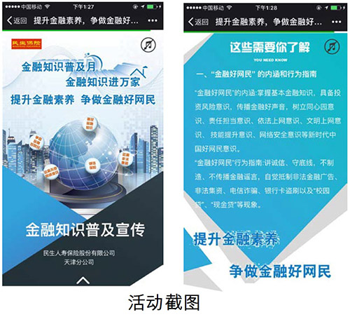 为更好的普及金融知识,践行民生保险“为民生服务”的企业使命,民生保险天津分公司于9月份在线上开展“金融知识普及月”有奖问答活动。通过该活动,用户可以了解到“金融好网民的内涵和行动指南”、“生活中的金融常识”、“销售误导行为的表现形式”、“如何远离校园不良网络借贷”等金融方面的知识内容,同时通过本次活动消费者还可以进行在线答题,回答正确者有机会获得公司赠送的参与奖品一份。以下为活动链接,欢迎您的参与和关注:http://u6071325.viewer.maka.im/k/TJNKAVYF?from=singlemessage&isappinstalled=0