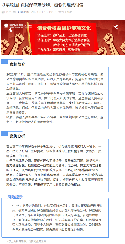 阳光财险 真假保单难分辨,虚假代理莫相信