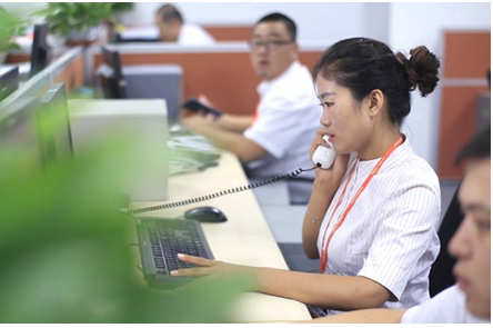 安欣雯在工位上接听电话,指导客户使用“平安理赔系统”