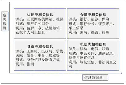 信息泄露类安全事件的发生都源于客户信息具有利用的价值,对利用者具有相当的吸引力,针对个人的重要程度而言,被泄露的客户信息主要有四种类型: