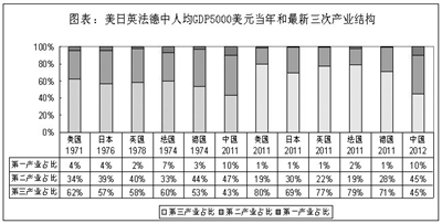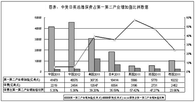 (二)我国与发达国家经济社会结构差异较大,保险业服务实体经济存在更大差距。从《图表:美日英法德中人均GDP5000美元当年和最新三次产业结构》和《图表:中美日英法德保费占第一第二产业增加值比例数据》来看:美日英法德五国均在上世纪70年代实现人均GDP5000美元,我国到2011年才实现这一目标,2012年刚突破6000美元(自1971年布林顿森林体系崩溃后,美元经过三轮贬值、两轮升值,目前美元指数还略低于上世纪70年代),而2011年美日英法德五国人均GDP已达4万美元上下。