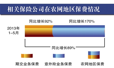 (三)公司获益。目前,已在60个乡镇、617个行政村搭建了保险服务网络,覆盖率达到67.95%,并形成了乡镇经管站、乡镇综治委等部门主导的模式。保险服务农网的搭建,为农网经理提供了稳定的服务展业环境,提高了服务人员发展的稳定性,在提升服务质量的同时,也为公司树立了良好的品牌形象,提高了公司在农村市场的拓展能力。2013年1-5月,参与农网建设的保险公司在农网地区保费同比增长89%,其中期交业务同比增长92%,意外险业务同比增长170%。