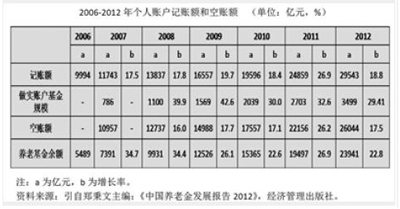 中国社会科学院于2012年12月17日发布的《中国养老金发展报告2012》显示,2011年养老金记账额达到24859亿元,全国14个地区养老金亏空700多亿元,而养老金个人账户空账达到22156亿元。这个数字可谓惊人,它意味着国内个人账户空账额继2007年突破万亿元大关后,现在突破2万亿元。