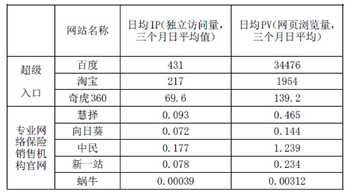 笔者利用www.alexa.cn网站分析工具获取了部分超级入口和专业网络保险销售机构的电脑端日均独立访问量(即独立用户数量)和日均网页浏览量,数据如下表所示。