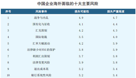 微观上,中国企业面临着政治风险、经济风险、法律风险和商业环境风险的多重考验。中国信保对600多位企业风险经理的问卷调查,获得了对企业影响最大的前十位风险事件(见下表)。