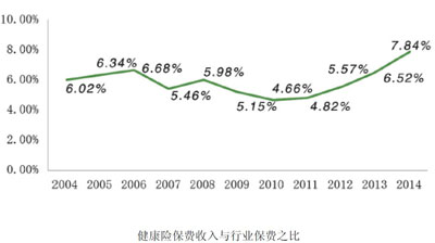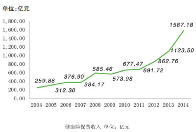 目前,国内提供健康保险的公司主要为寿险公司,另外还有一部分专业健康保险公司。目前国内已经成立的专业健康保险公司有人保健康、和谐健康、太保健康、昆仑健康和平安健康。2014年中国健康险保费收入1587.18亿元,同比增长41.27%,占年度保费收入的7.84%。2004-2014年中国健康险保费收入年均增长19.84%,同期保险行业保费收入年均增长16.70%,中国健康险发展速度较快,发展潜力较大,是值得重点研究和发展的险种。