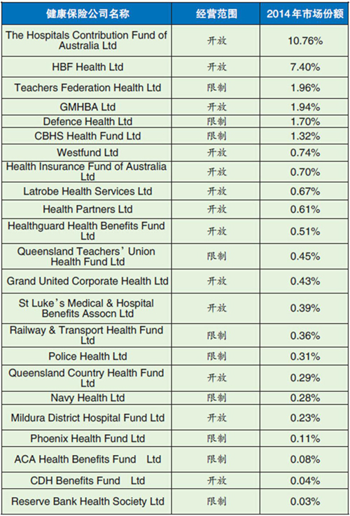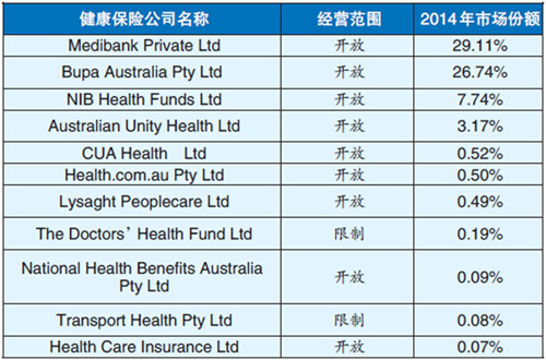 澳大利亚财政为当年7月1日到次年6月30日。2013年7月1日至2014年6月30日,前五大健康保险公司(包括Medibank Private Limited、Bupa Australia Pty Ltd、The Hospitals Contribution Fund of Australia Ltd、NIB Health Funds Ltd、HBF Health Ltd)都是开放经营范围的保险公司,市场份额81.6%。3家营利性,2家非营利性,但规模最大的前两家Medibank Private Limited、Bupa Australia Pty Ltd都是营利性保险公司。澳大利亚最大的健康保险公司Medibank原是国有企业,经过股份化和公开募股,2014年12月25日正式上市。