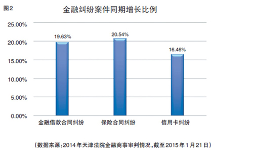 以北京的法院为例,自2010年以来,北京市各类涉及保险诉讼案件的数量年均达23000多件。据山西省不完全统计,2013年全省保险诉讼案件的收案数量大约在14400件左右,其中年度亿元财产险保费引发的保险诉讼案件数量大约100件左右。2014年,天津市高级人民法院通报的“2014年天津法院金融商事审判情况”显示,在以金融借款合同纠纷、保险合同纠纷和信用卡纠纷为主的金融商事案件中,保险合同纠纷案件数量激增,同期增长比例为20.54%,比金融借款合同纠纷的增长比例高出4.64%(见图2)。
