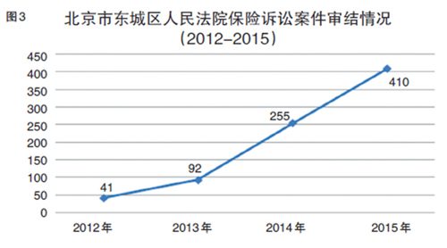 我国基层人民法院承担着审理保险诉讼案件的重大工作,截至目前,我国基层法院审理保险诉讼案件的数量达到107942件,占全国法院审理保险诉讼案件总数量的77.1%。可见,基层法院面对着保险诉讼案件激增的直接冲击。以北京市东城区人民法院为例,2005年至2015年,北京市东城区人民法院审理的保险诉讼案件数量以40%的速度逐年增长,根据Open Law数据库录入的审理案件,从2012年到2015年仅3年时间,东城区人民法院审理保险诉讼案件的数量逐年以3倍以上的比例持续增长(见图3)。