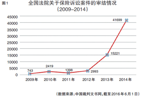 根据中国裁判文书网统计的数据,仅以保险诉讼案件为例,自2009年至2014年,全国法院审理保险诉讼案件数量呈现跳跃式的增长(见图1)。