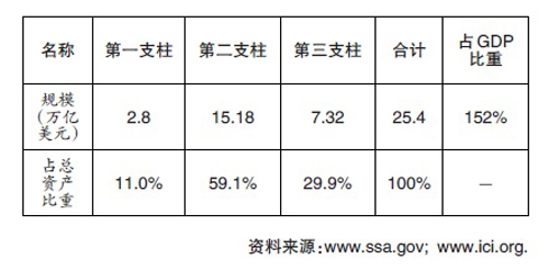 以美国为例,2015年其养老金体系三个支柱积累的资产总量为25.4万亿美元,占当年GDP(17.4万亿美元)的比例高达152%。其中,第一支柱积累的养老金资产仅占资产总量的11%,而第二、三支柱私营养老金非常发达,积累的养老金资产存量巨大,占资产总量的89%(参见表1)。