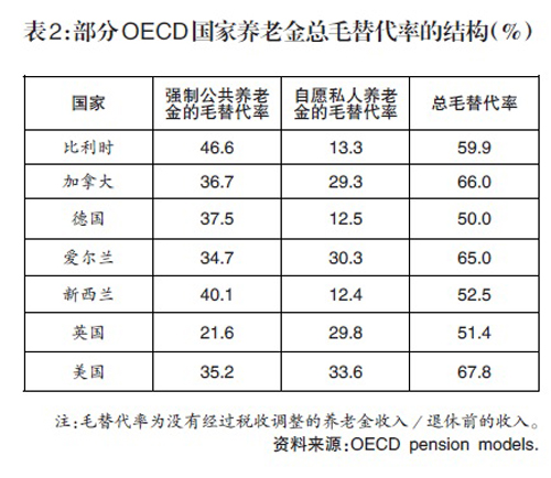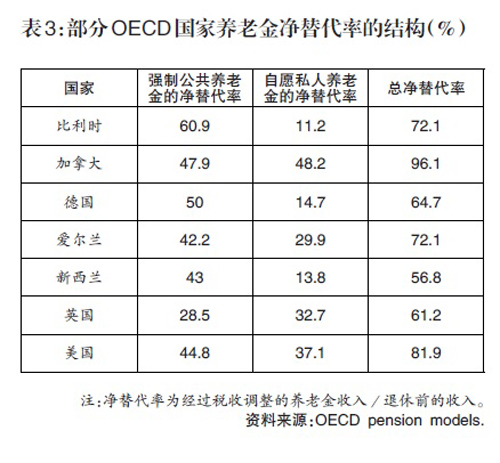 由于很多国家更为均衡地发展养老保险的三支柱体系,私营养老金发展迅速,其对退休人员的收入贡献不断提升。以美国为例,其退休人员的养老金总毛替代率为67.8%,其中第一支柱的毛替代率为35.2%,作为私营养老金的第二、三支柱的毛替代率为33.6%,其对退休人员的收入贡献几乎等同于公共养老金(参见表2)。同样的,美国养老金净替代率为81.9%,第一支柱的净替代率为44.8%,作为私营养老金的第二、三支柱的净替代率为37.1%(参见表3)。其他一些OECD国家也大致如此,作为私营养老金的第二、三支柱在提升养老金替代率方面发挥了重要的作用(参见表2和3)。