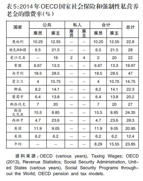 2014年,OECD 21个国家强制性养老金的雇员个人缴费率平均为7.09%,雇主缴费率平均为10.48%,总缴费率平均为17.57%,低于中国基本养老保险28%的缴费率(参见表4)。OECD 13个国家社会保险和强制性私营养老金中雇员个人缴费率平均为8.29%,雇主缴费率平均为15.55%,总缴费率平均为23.85%(参见表5),远低于中国社会保险40%左右的总缴费率。