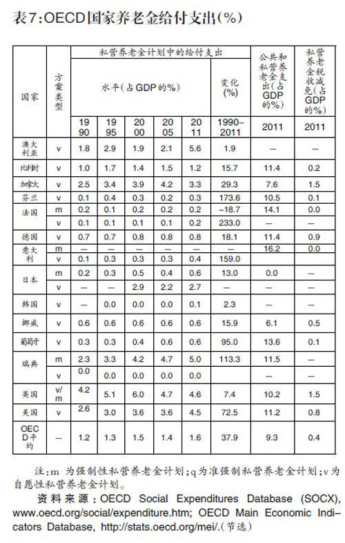 OECD国家通过各种形式的税收优惠政策提升商业养老保险的需求(参见表6),即政府通过让渡税收收入,激励企业和个人参加各种形式的私营养老金计划。正是在税收优惠政策的鼓励下,OECD国家的私营养老金快速发展,1990-2011年其养老金给付中,私营养老金的给付水平提高了37.9%。2011年,OECD国家平均以占GDP 0.4%的税收减免带来了占GDP 1.6%的私营养老金支出,税收对养老金的放大效应为4倍(参见表7)。