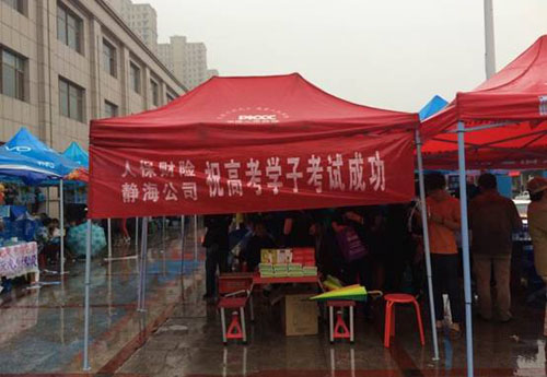 同时,天津市静海支公司组织高考志愿服务活动,于高考期间在考点附近设立了爱心服务站,为参加高考的学子及陪同考生的家长营造一个轻松、便捷、舒适的高考环境。工作人员准备了遮阳伞、休息板凳、雨伞、毛巾、面巾纸、水杯、纯净水等用品,免费提供给考生及家长。高考期间,天津地区下起了蒙蒙细雨,静海支公司的爱心服务站为考生家长们提供了休息避雨的场所,得到了陪考家长的诸多好评。(人保财险天津市分公司)