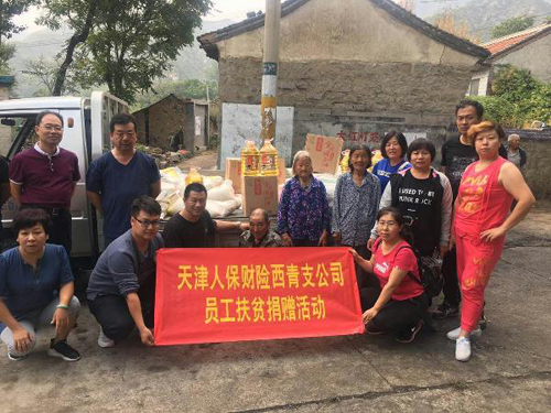 西青支公司员工自2010年开始,一直开展爱心捐赠活动,曾多次捐赠困难学生和困难家庭。2017年9月,在西青支公司经理室的号召下,该支公司员工、营销员等共79人,共捐赠4190元善款。9月16日,西青支公司员工代表将捐赠的物品米、面、油送到河北省涞源县走马驿镇五间房村17户困难户中,这些困难户包括孤寡老人、困难家庭等。