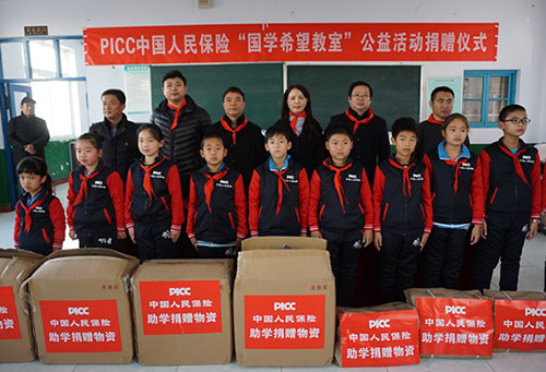 “国学希望教室”助学公益活动已连续举办四年,以弘扬国学文化、汲取国学精髓为主旨,由中国人保公益慈善基金会和中国青少年发展基金会联合出资,2017年共为全国150所偏远地区小学捐助国学教室,向22500名学生赠送国学书籍和运动服。
