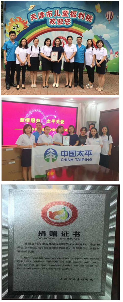 2018年8月22日,太平养老保险股份有限公司天津分公司以“至情服务、太平关爱”为主题的捐献活动在天津市儿童福利院举行。活动现场,太平养老天津分公司向天津市儿童福利院捐赠了院方急需物资。太平养老天津分公司副总经理商学巍总及员工代表、天津市儿童福利院张主任参加了捐赠仪式。