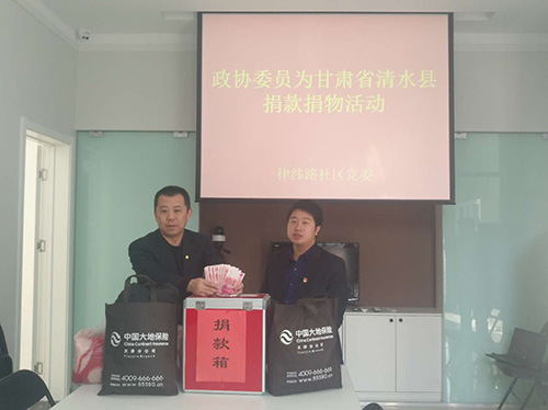 日前,天津市河北区慈善协会转发了“为甘肃清水县捐款捐物的倡议书”及相关活动的通知,中国大地保险天津分公司知晓该活动后,由总经理室牵头,综合部组织全体员工积极参与捐款捐物。