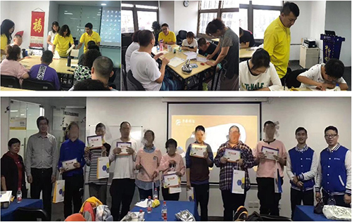 由华泰人寿天津分公司提供免费场地,星星的孩子们坚持每周来职场学习硬笔书法。在父母、老师和“金蜜蜂们”的陪伴下,10月23日,第十期硬笔书法活动完美收官。