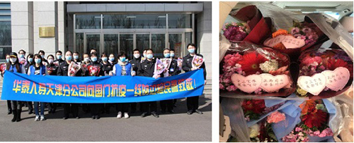 4月5日上午,华泰人寿天津分公司总经理助理兼工会主席薛梅携金蜜蜂志愿者前往天津机场出入境边防检查站,为坚守一线的200多名边检民警送去鲜花,用这种简单的方式表达公司对于疫情防控工作的大力支持。