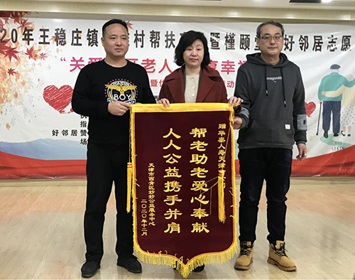 12月13日,在王稳庄困难村及社区助困助老暨槿颐堂杯好邻居志愿者评选闭幕式上,华泰人寿天津分公司荣获由天津市西青区妙妙公益服务中心颁发的“帮老扶老爱心奉献人人公益携手并肩”的爱心锦旗。