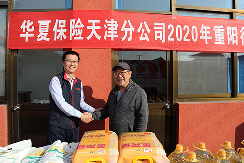 2020年11月,华夏保险天津分公司再次与西青区精武镇政府、海河传媒中心今晚报事业部蓟州区杨津庄镇驻村帮扶组携手开展重阳敬老活动,先后来到西青区盛兴家园社区、杨津庄镇北鲁庄村和下窝头镇下窝头村,看望并慰问部分生活困难村民及在乡复员抗战老兵,给他们送上真挚的祝福和亲切的慰问。