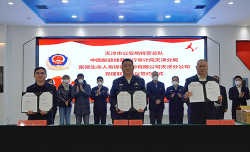 活动最后,特警总队、邮储银行天津审计分局、富德生命人寿天津分公司三方共同签署了党建联建协议,正式成为共建单位,为日后的互动和交流奠定了良好基础。
